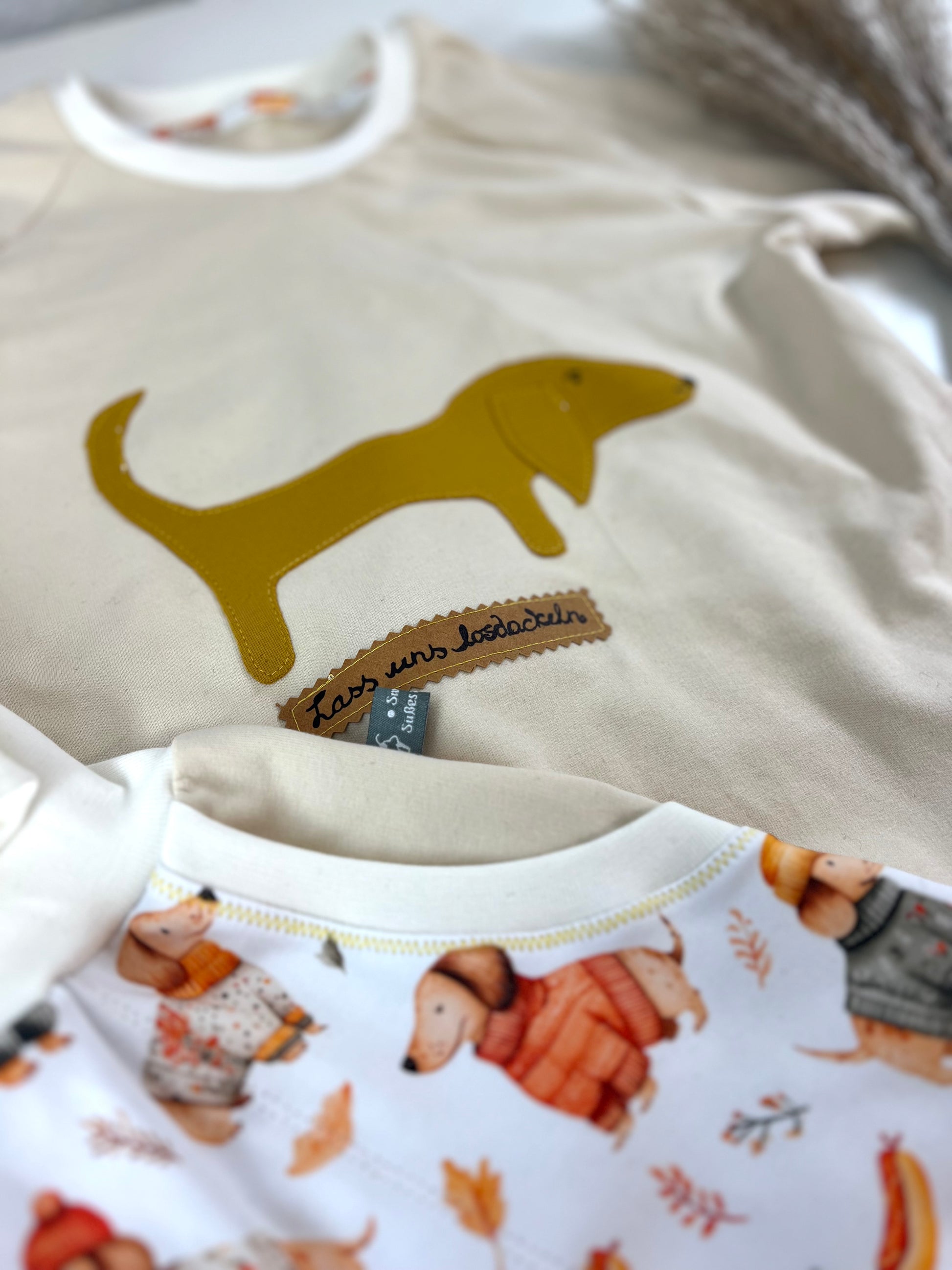 Alles ist so geschnitten, dass nichts zwickt, rutscht oder einengt – ideal für aktive Kinder. Wenn Du magst gib mir gern die Maße Deines Kindes im Personalisierungsfeld an sowie Deinen Wunschtext für das SnapPapLabel. Wenn Du nichts angibst, fertige ich den Pulli mit dem Text "Lass uns losdackeln" an.