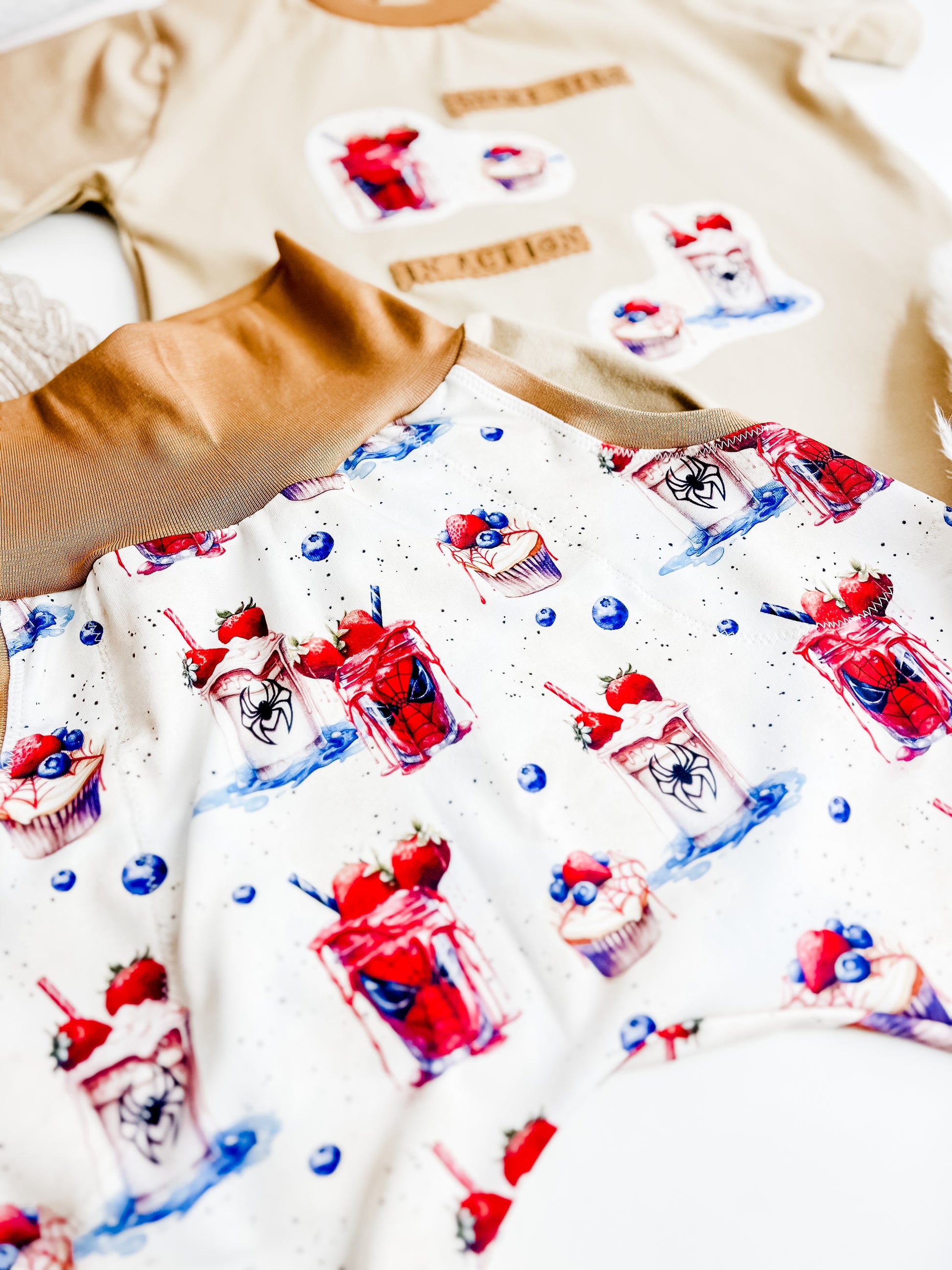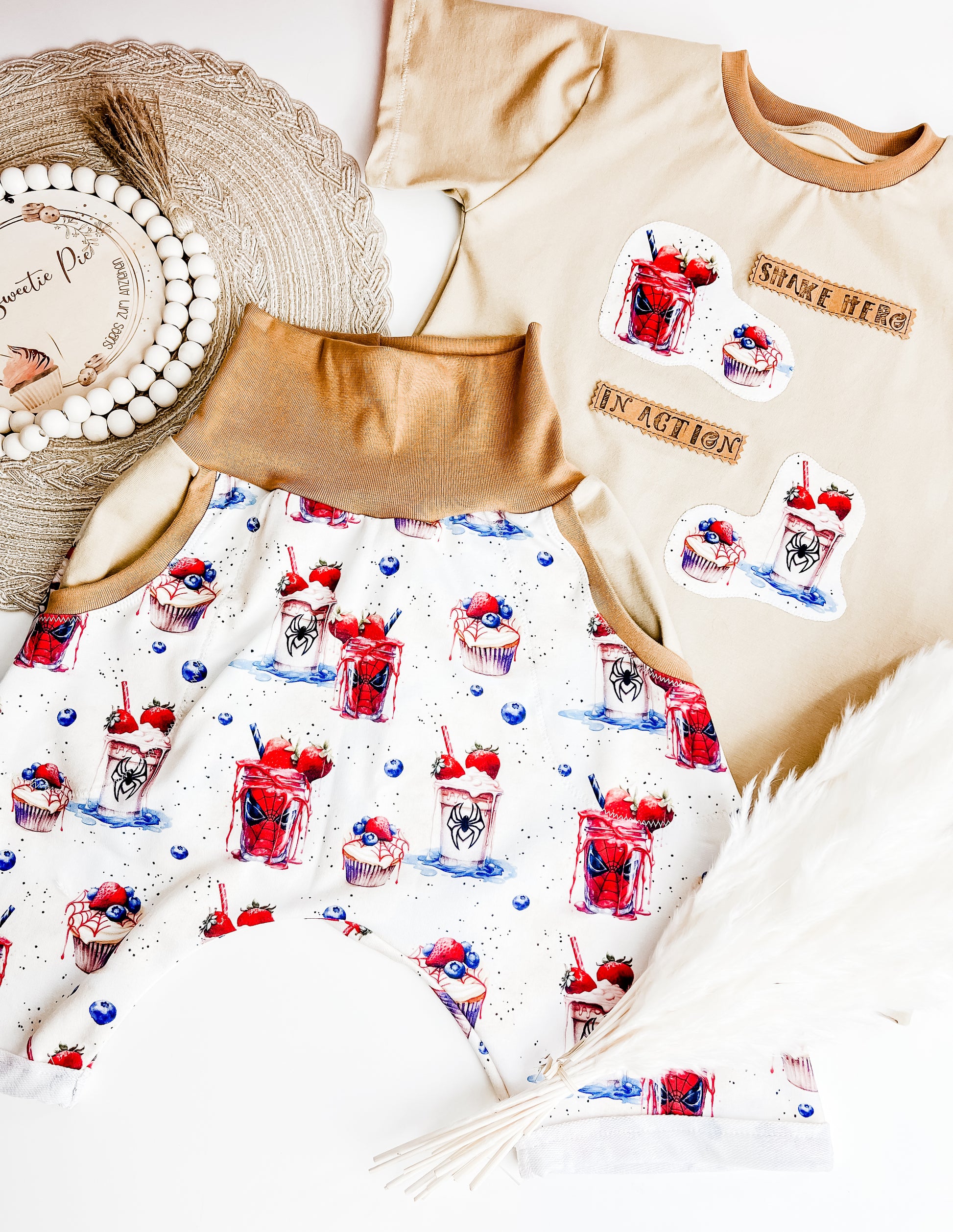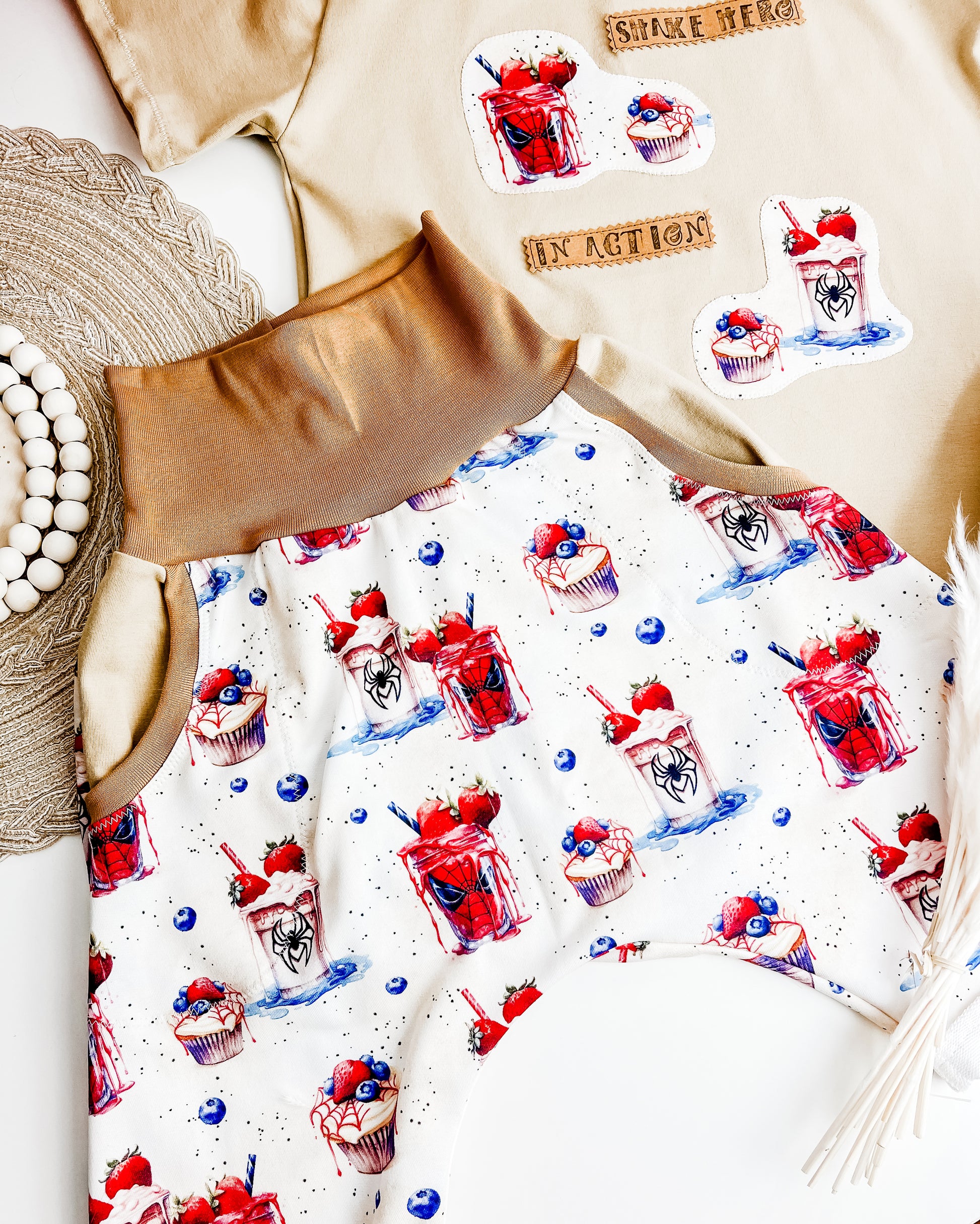 🍦Das Set besteht aus einem beigefarbenen T-Shirt mit Applikationen und einem frechen Statement-Spruch auf SnapPapLabel, kombiniert mit einer kurzen Slim Harem Hose mit Taschen. Der cremefarbene Stoff ist mit coolen Spiderman-inspirierten Shakes und Muffins bedruckt – ein absolutes Highlight für kleine Superheld*innen!