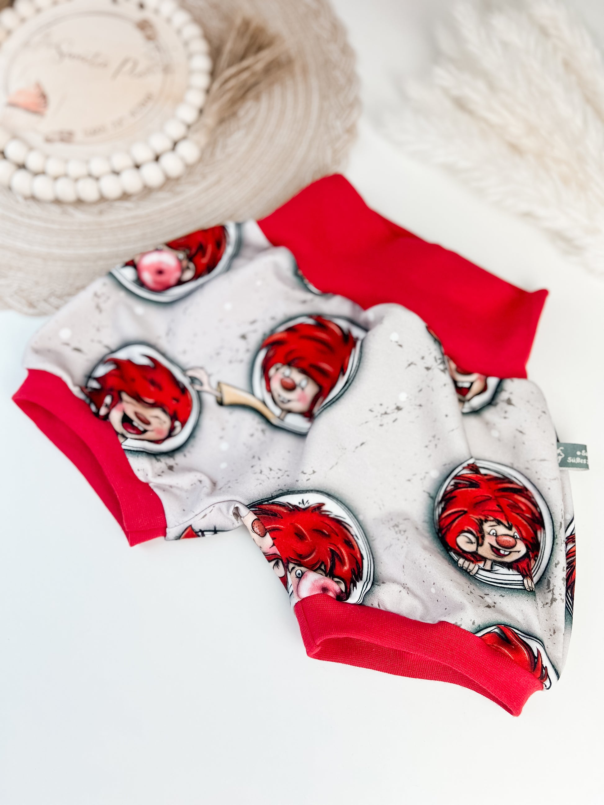 Diese kurze Baby Pumphose ist perfekt für warme Tage – luftig, bequem und frech im Design. Der graue Stoff wird von einem kleinen, frechen Wicht (inspiriert von einem berühmten Kobold) geziert, der mit seiner verschmitzten Art die Herzen kleiner und großer Fans erobert.