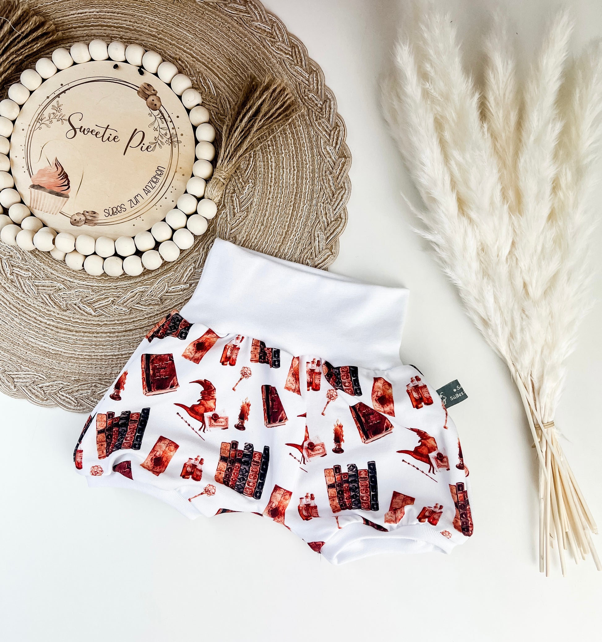 Diese kurze Pumphose ist wie gemacht für kleine Zauberfans. Auf weißem Hintergrund tummeln sich magische Motive wie Bücher, Zaubertränke, Hüte und Briefe – liebevoll gestaltet und perfekt für kleine Abenteurer.