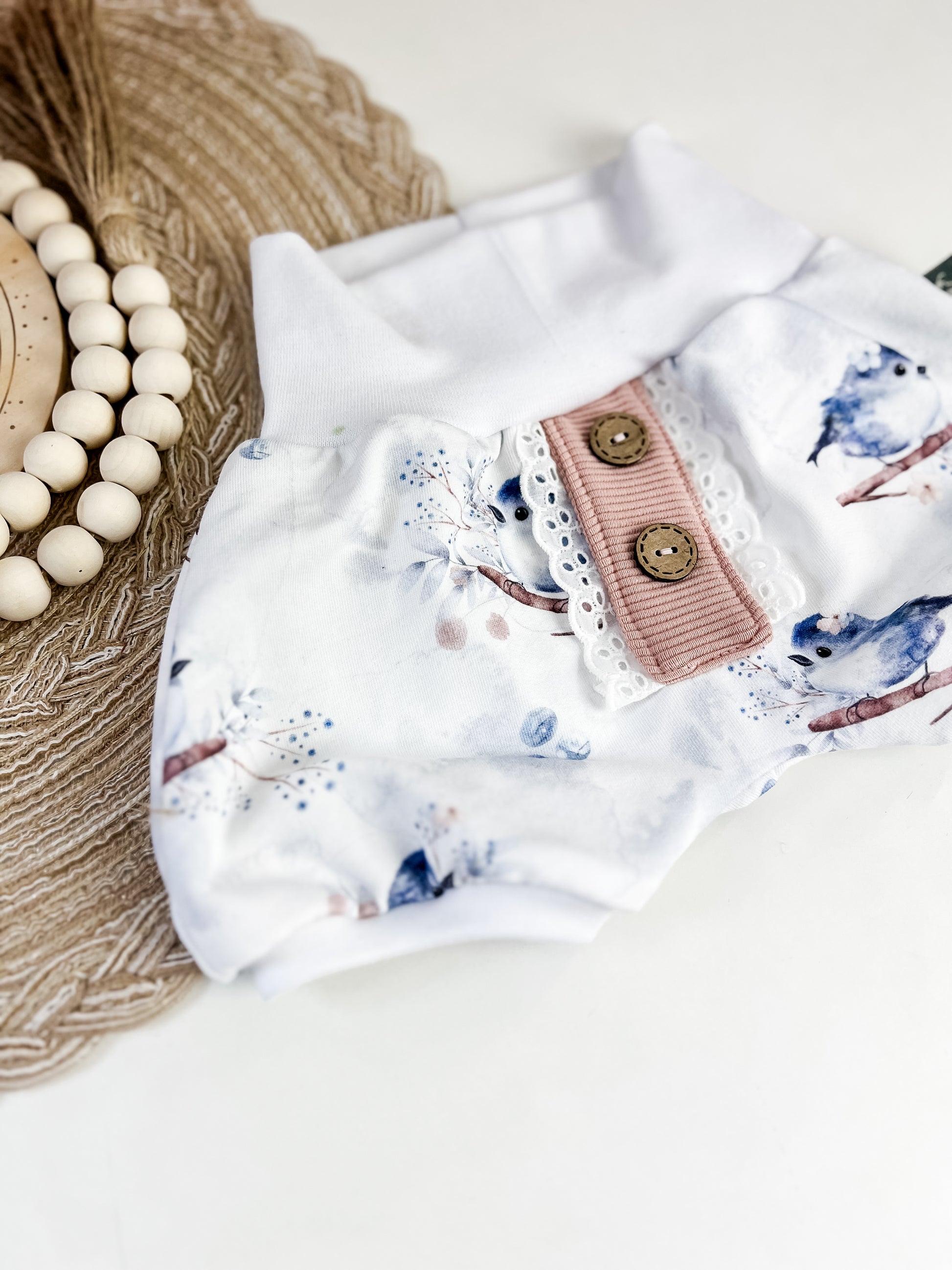Kurze Pumphose Baby Birdies– Weiß mit blauen Vögelchen Blumen – Handgemacht aus Bio Baumwolle – Gr. 56 - 122 – Mitwachsend & bequem – Geschenk zur Geburt