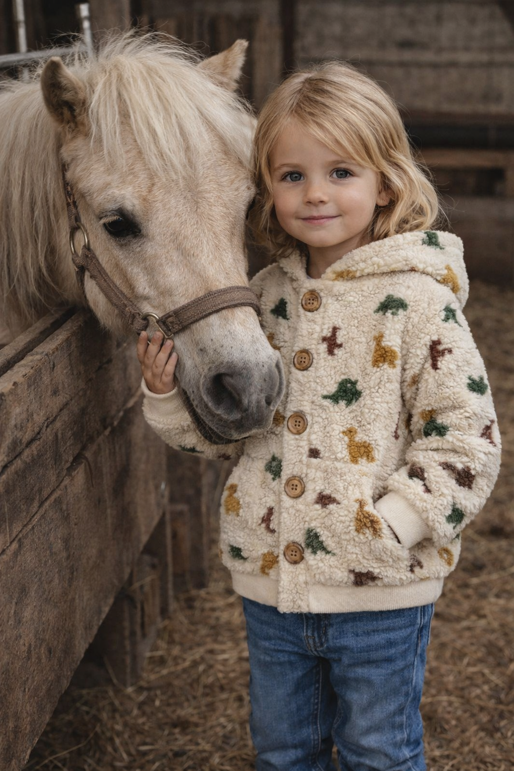 Der sandfarbene Teddystoff mit liebevollen Dino-Motiven verbindet Abenteuerlust mit einem ruhigen, natürlichen Look. Die Jacke ist bewusst so gestaltet, dass sie verspielt wirkt, ohne laut zu sein – perfekt für Mamas, die kindgerechte Motive mögen, aber trotzdem Wert auf Stil legen.