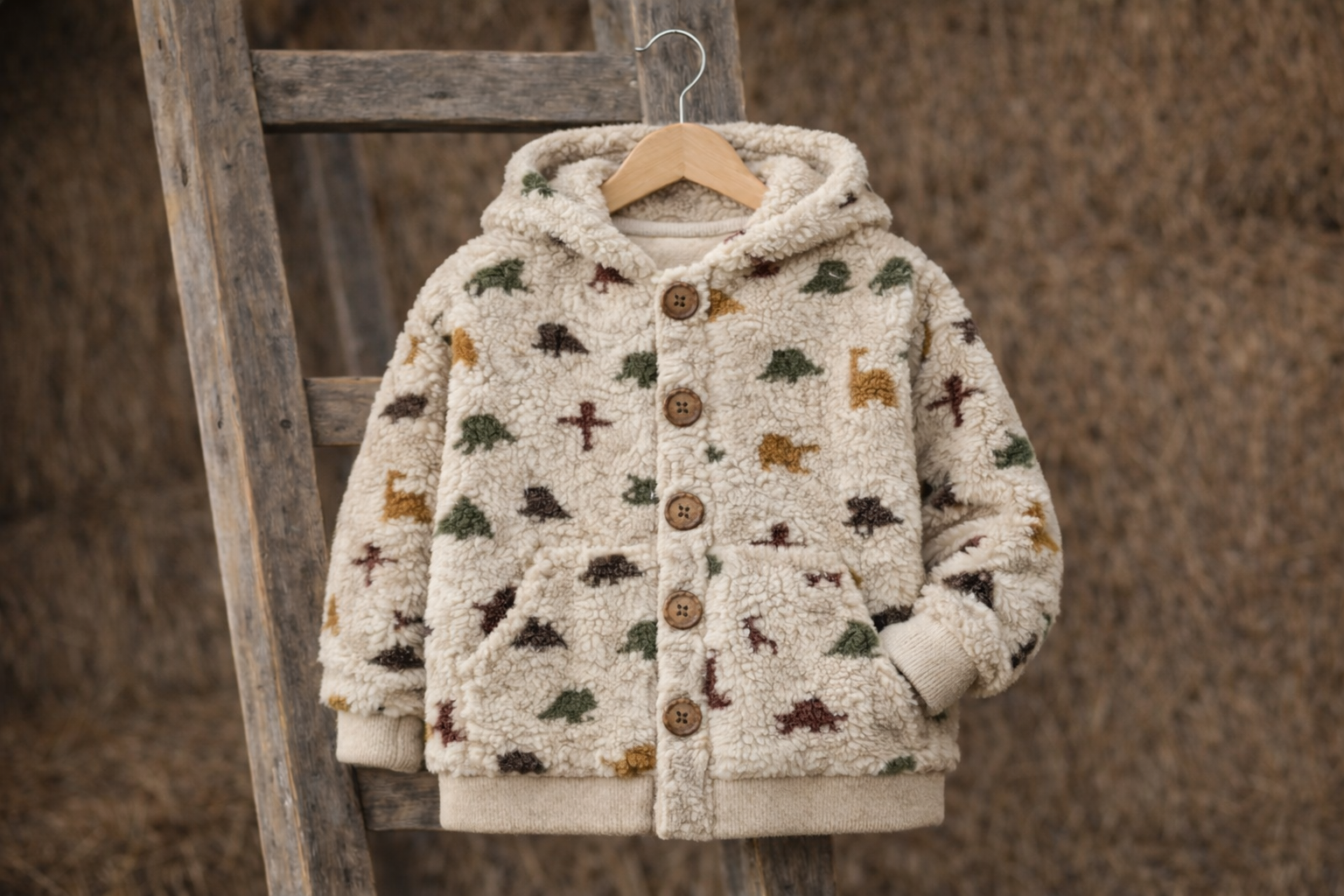 Kuschelige Teddyjacke für Kinder mit Dinosaurier Motiv | Sandfarbene Übergangsjacke mit Kapuze | Cozy Blouson für Baby & Kind