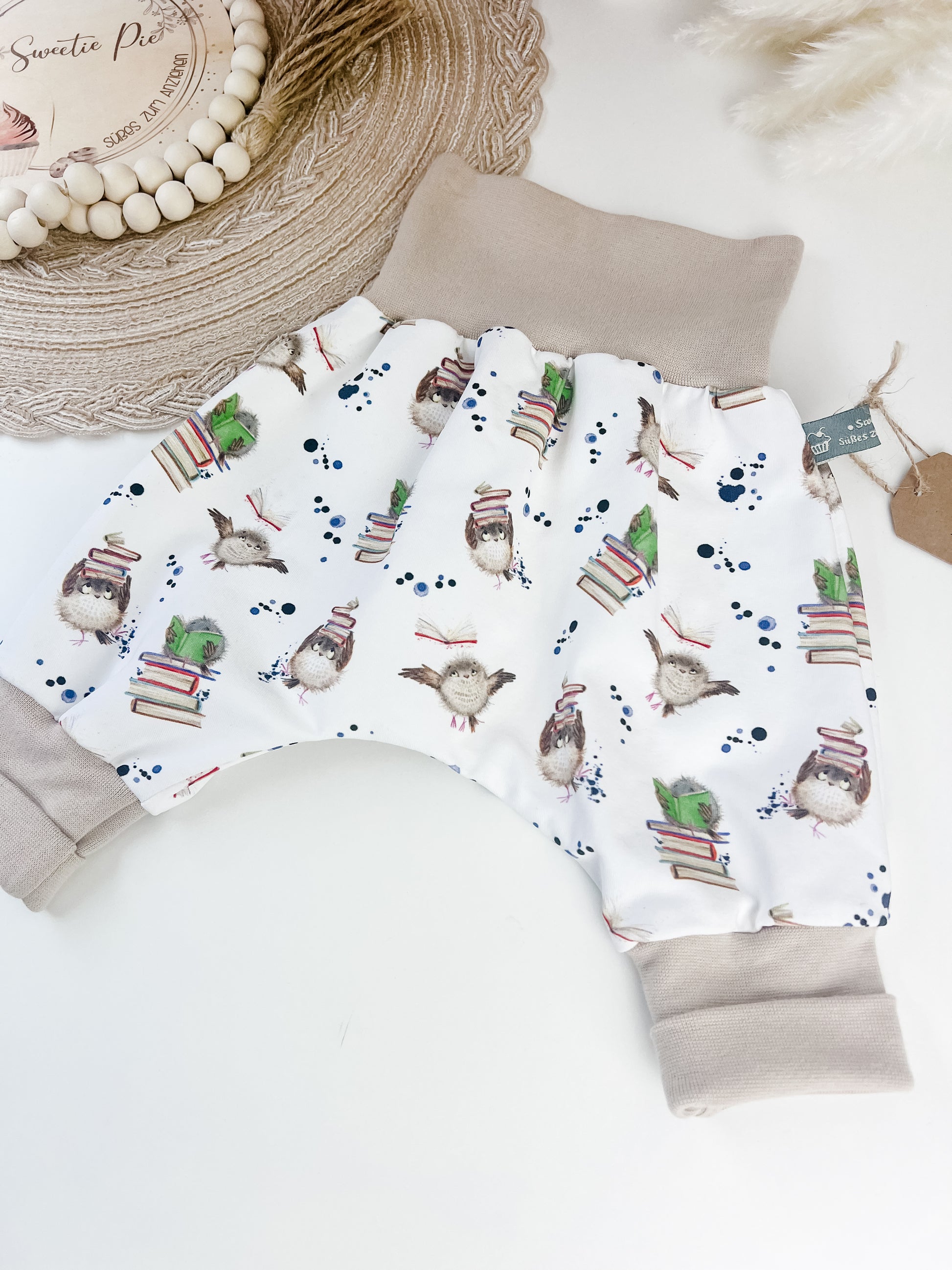 Diese liebevoll handgefertigte Baby-Pumphose aus weicher Bio-Baumwolle begeistert mit einem zauberhaften Eulenmotiv, bei dem die kleinen Eulen vertieft in ihre Bücher sind. Ein besonderes Highlight für alle Bücherfreunde und ein echter Hingucker im Alltag!